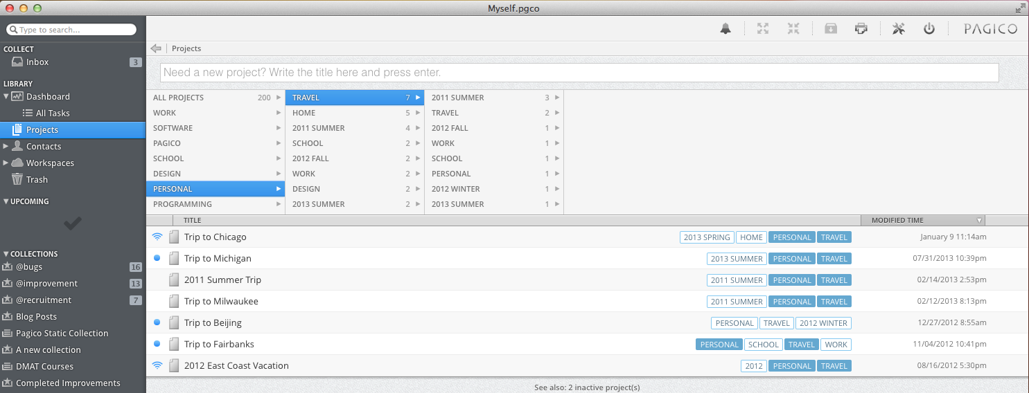 Built with a solid data management foundation, Pagico is more than capable of organizing your library of projects and allows you to easily navigate your ocean of projects. As long as you tagged them properly, finding the right project is a breeze. See the tag browser in action (10-second video) .